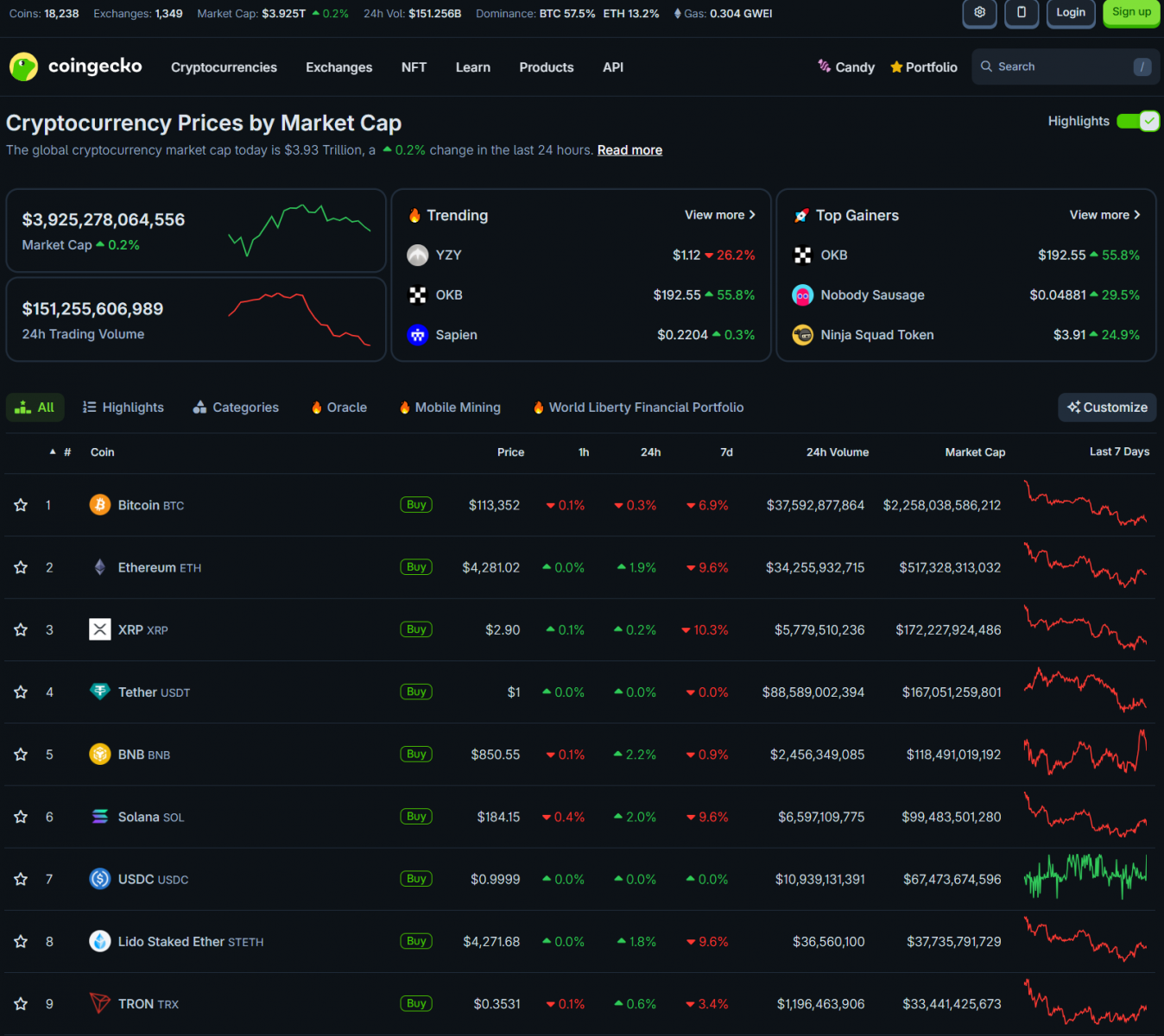 Bitcoin ngày qua có thời điểm giảm xuống mức thấp 112,900 USD, sau đó hồi về quanh 113,000 USD. Nhiều altcoin lớn đi ngang hoặc tăng nhẹ. Vốn hóa thị trường crypto wor mức 3.92 nghìn tỷ USD.