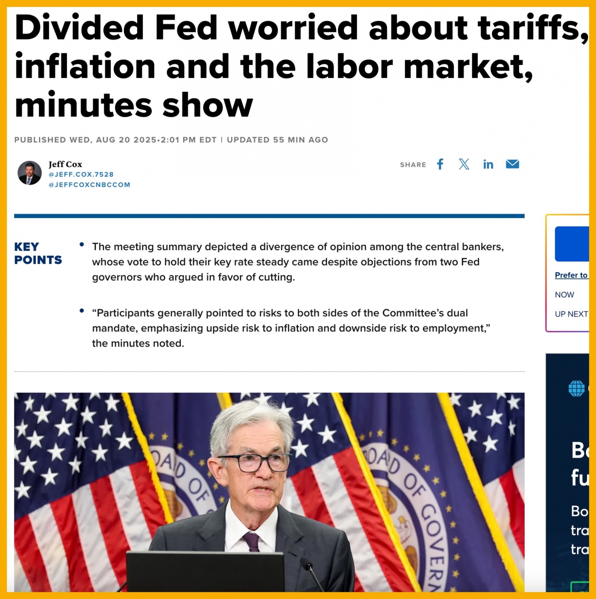 Biên bản cuộc họp tháng 7 của FED cho thấy có sự chia rẽ hiếm hoi giữa các nhà hoạch định chính sách. Phần lớn đồng ý giữ nguyên lãi suất ở mức 4.25%–4.5%, nhưng có hai thống đốc bỏ phiếu muốn cắt giảm ngay. Đây là lần đầu tiên trong hơn 30 năm có hơn một người bất đồng.