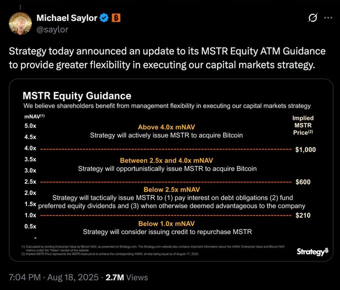 Cổ phiếu MicroStrategy (MSTR) vừa giảm xuống 336 USD, đây là mức thấp nhất từ tháng 4 sau khi công ty thông báo hạ ngưỡng bán cổ phiếu để huy động vốn mua thêm Bitcoin. Michael Saylor cho biết công ty bổ sung hướng dẫn vốn nhằm linh hoạt hơn trong chiến lược thị trường.