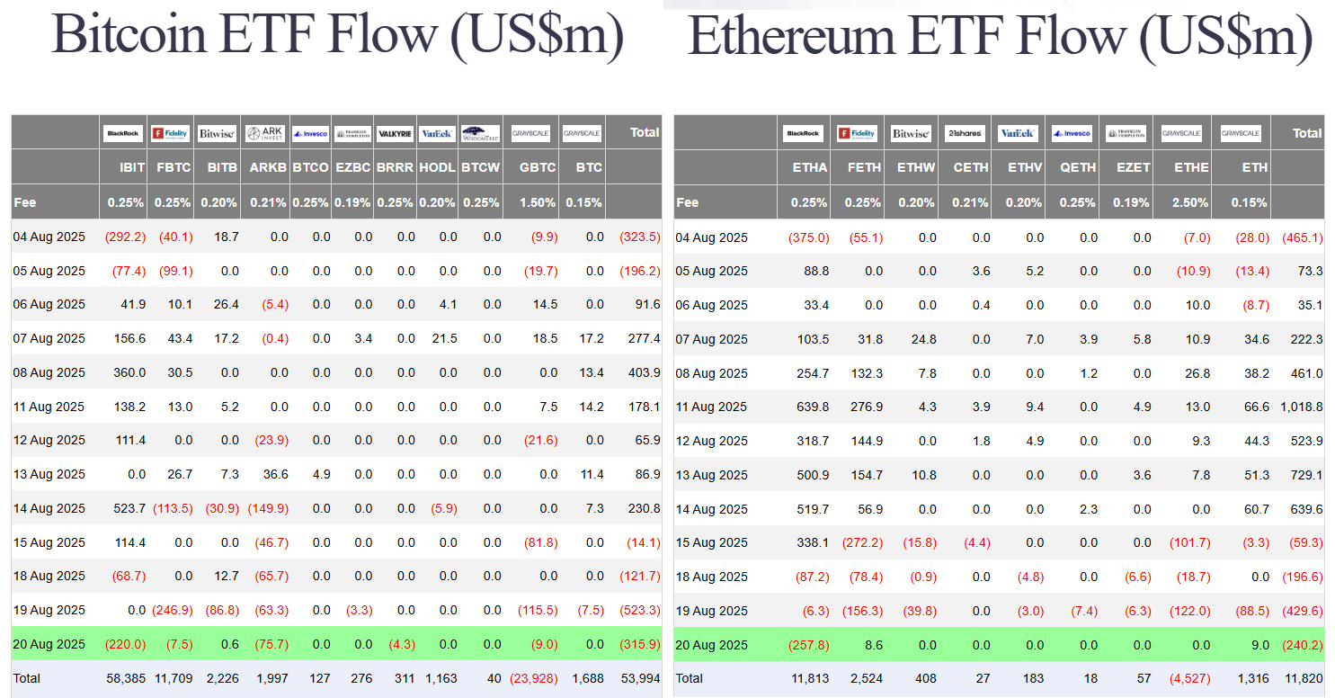 Các quỹ BTC spot ETF tiếp tục có dòng tiền rời khỏi với tổng 315.9 triệu USD. Còn ETH spot ETF cũng có 240.2 triệu USD tiền ra.