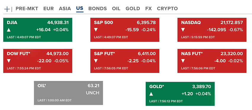 Thứ tư (20/08-US), chứng khoán Hoa Kỳ đóng cửa có Dow Jones đi ngang, S&P 500 và Nasdaq đều giảm lần lượt 0.24% và 0.67%. Hợp đồng tương lai của chứng khoán nghiêng về xu hướng giảm. Vàng và dầu tăng nhẹ lên 3389 USD/ounce và 63 USD/thùng.