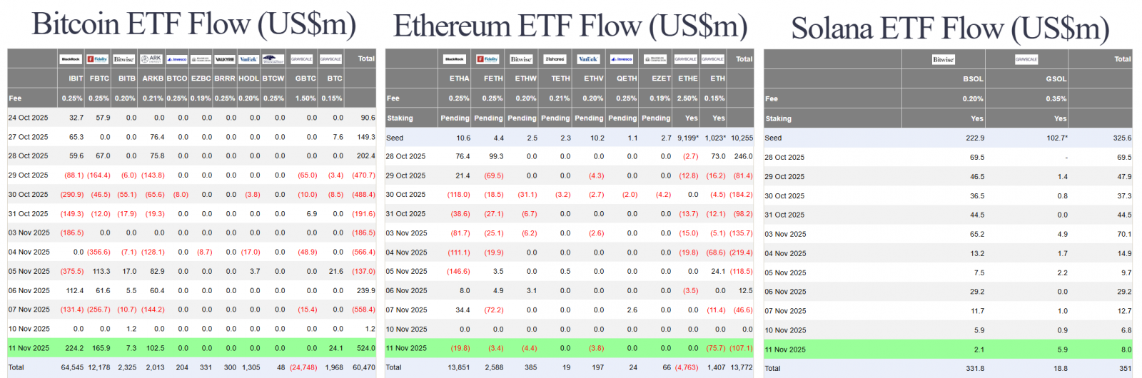 Các quỹ BTC spot ETF Hoa Kỳ đã có dòng tiền vào lớn 524 triệu USD. Ngược lại, ETH spot ETF lại có 107.1 triệu USD tiền rời khỏi các quỹ. OL ETF có dòng tiền vào 8 triệu USD.