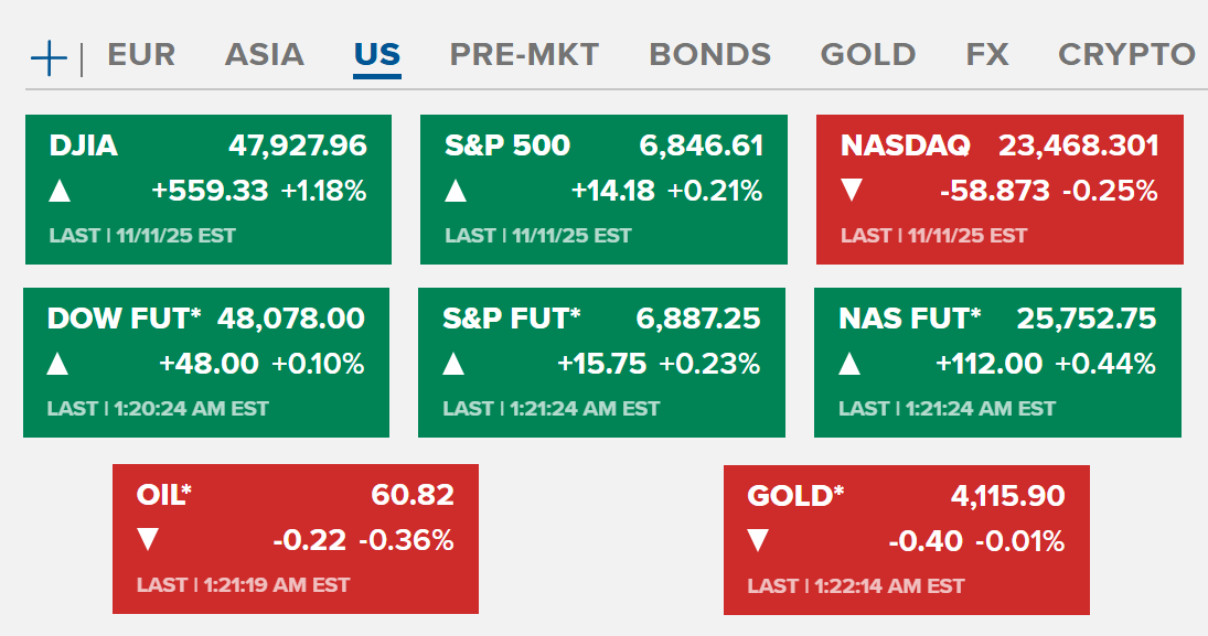 Chứng khoán Hoa Kỳ tăng tốt ở Dow Jones đã tăng 1.18% và đạt đỉnh mới trong phiên, S&P 500 cũng tăng 0.21% và Nasdaq giảm 0.25%. Hợp đồng tương lai của chứng khoán tiếp tục tăng nhẹ. Dầu và vàng giảm nhẹ quanh lần lượt 60.82 USD/thùng và 4115 USD/ounce.