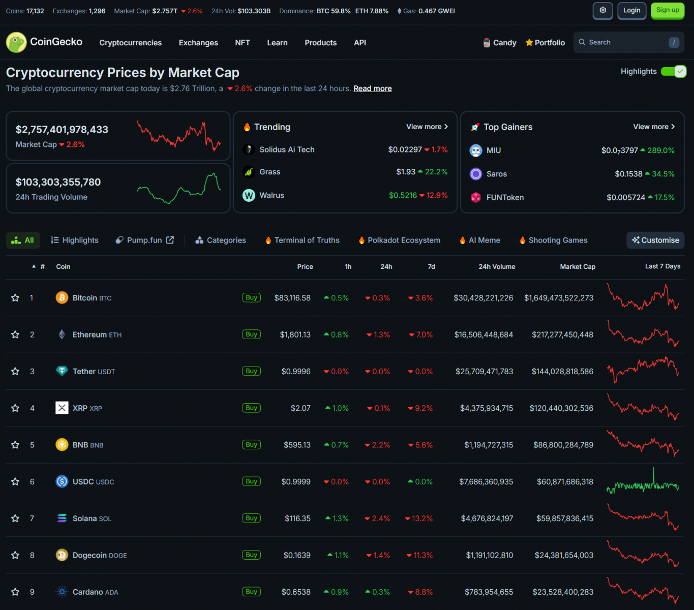 Bitcoin vẫn xoay quanh 83,000 USD. Xu hướng chung của các altcoin lớn trong ngày qua vẫn giảm. Vốn hóa thị trường crypto ở mức 2.757 nghìn tỷ USD.