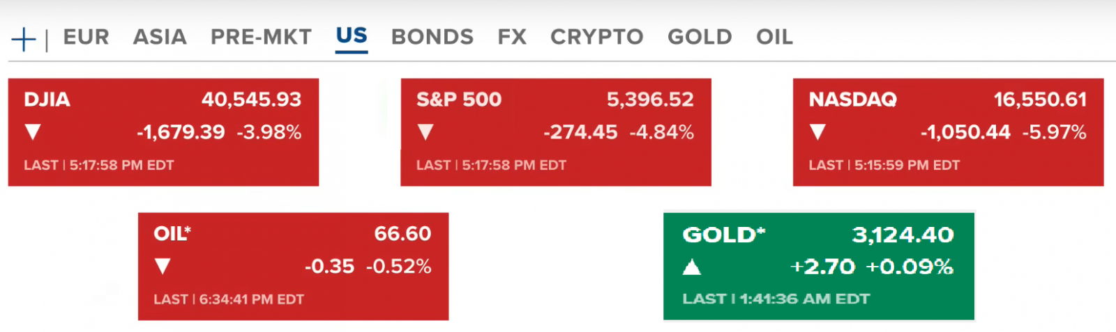 Chứng khoán Hoa Kỳ thứ năm (03/04-US) tiếp tục giảm mạnh với Nasdaq giảm nhiều nhất lên đến 5.97%. Đã có 2.85 nghìn tỷ USD bị bốc hơi khỏi thị trường chứng khoán Mỹ trong thứ năm. Hợp đồng dầu cũng có một ngày rất tệ với giá giảm về 66.6 USD/thùng. Còn vàng vẫn ở mức cao 3124 USD/ounce.