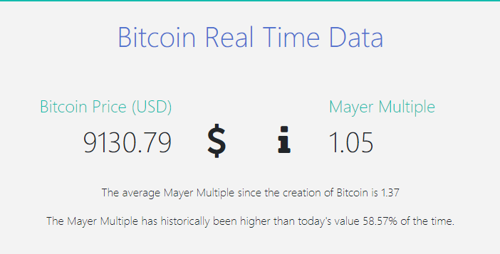 Mayer Multiple là tỷ lệ giữa giá bitcoin hiện tại với giá trung bình của bitcoin trong 200 ngày gần nhất. Tỷ lệ này sẽ cho thấy được giá hiện tại của bitcoin cao hơn hay thấp hơn giá trung bình của bitcoin, nếu chỉ số này càng lớn thì giá bitcoin hiện tại càng chênh lệch nhiều so với giá trung bình của nó.