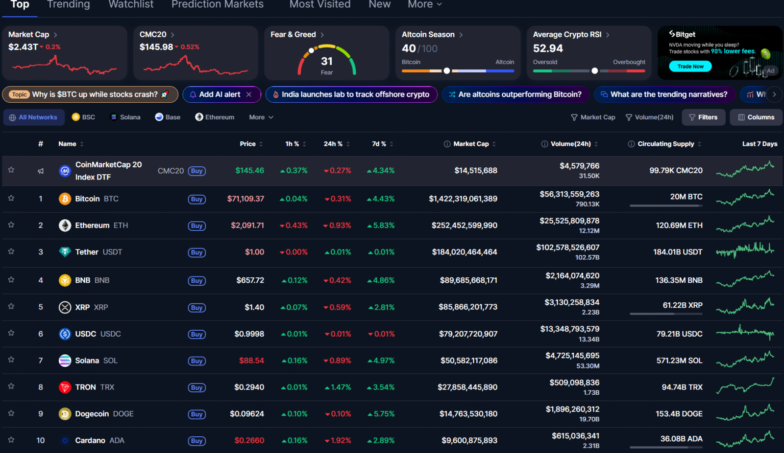 Về Bitcoin sau khi tăng lên 74,000 USD đã giảm về quanh 71,000 USD. Các altcoin lớn cũng đều giảm theo. Vốn hóa thị trường crypto giảm nhẹ về 2.43 nghìn tỷ USD.