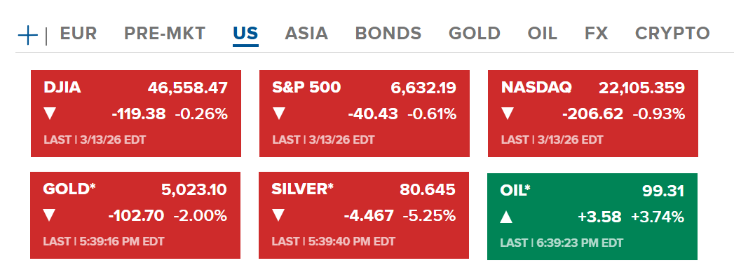 Kết thúc phiên giao dịch thứ sáu (13/03-US), thị trường chứng khoán Hoa Kỳ tiếp tục giảm điểm, với Nasdaq giảm nhiều nhất 0.93%. Hợp đồng và và bạc cũng tiếp tục giảm về quanh lần lượt 5023 USD/ounce và 80.6 USD/ounce. Riêng dầu tiếp tục tăng lên quanh 99.31 USD/thùng.