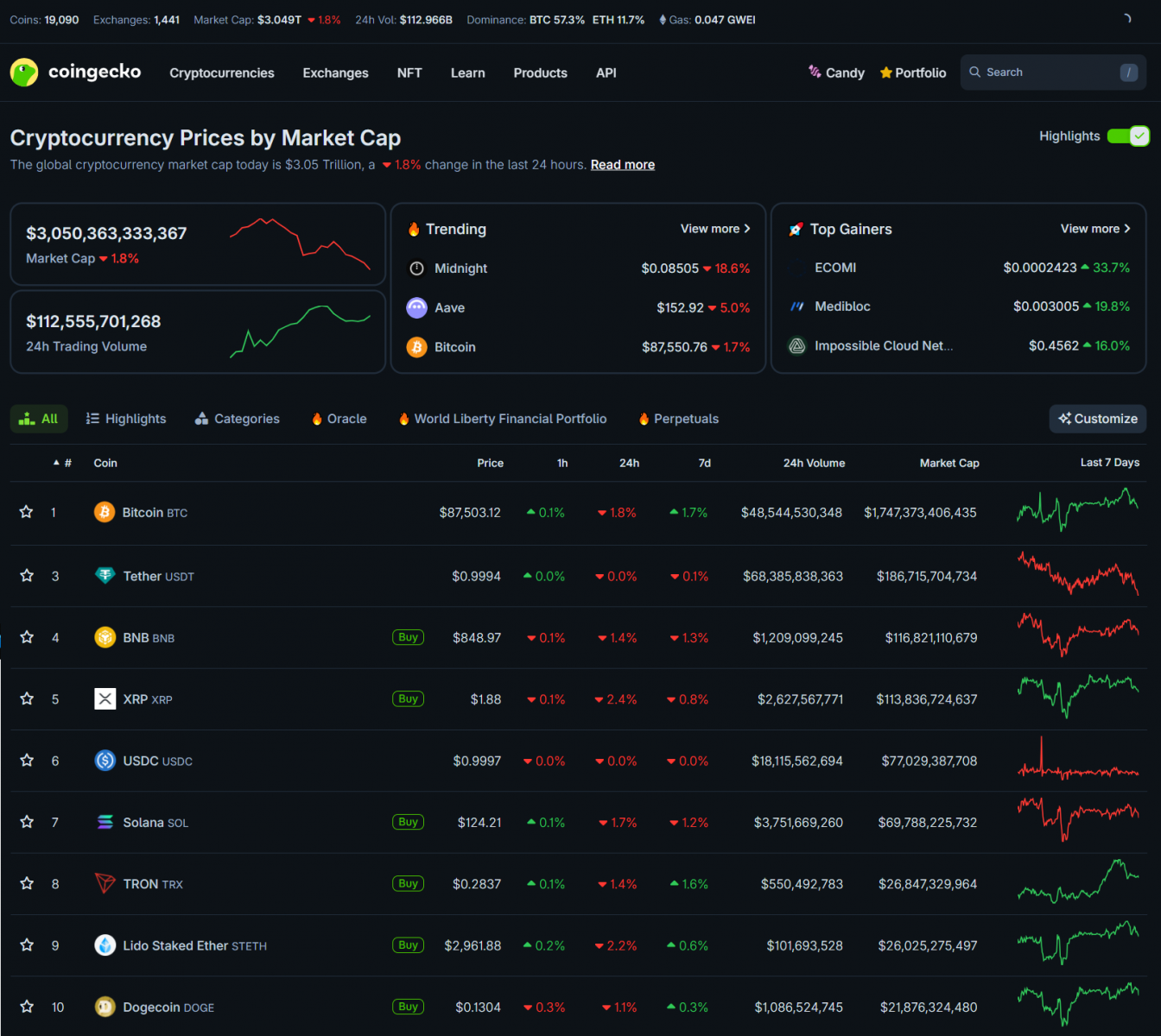 Bitcoin cũng tăng lên nhưng sau đó điều chỉnh quanh 87,000 USD. Hầu hết các altcoin lớn đều giảm nhẹ. Vốn hóa thị trường crypto ở mức 3.05 nghìn tỷ USD.