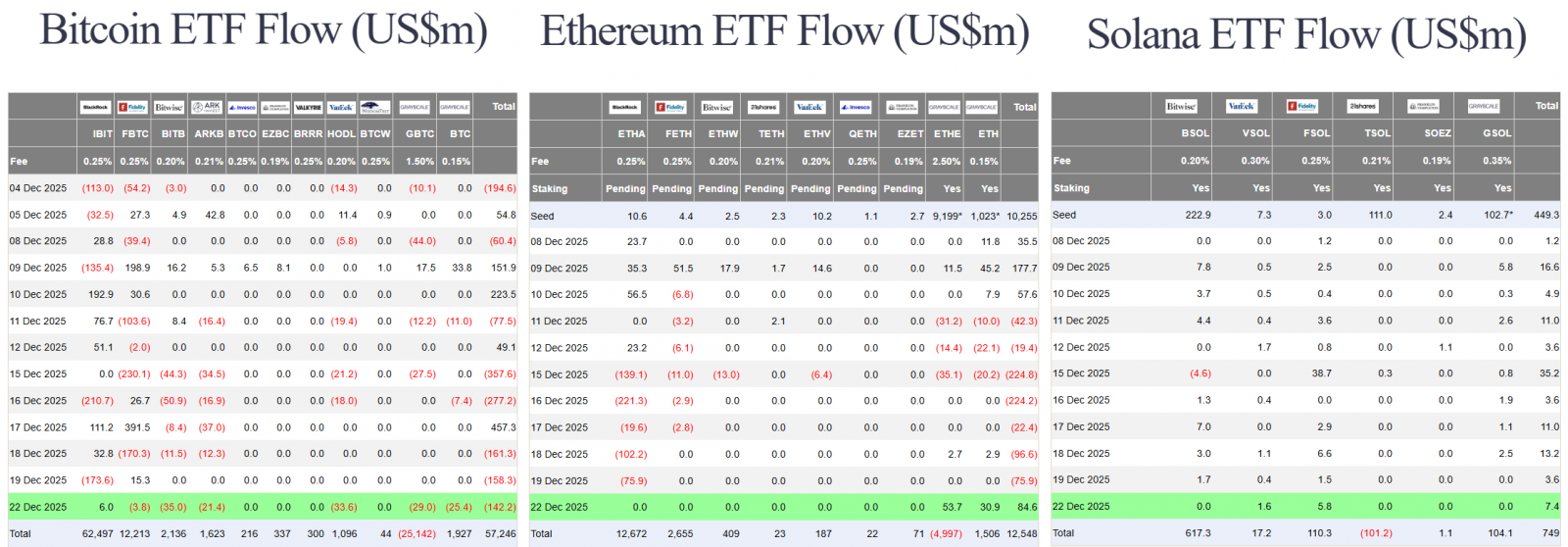 Các quỹ BTC spot ETF Hoa Kỳ trong thứ hai có dòng tiền rời khỏi 142.2 triệu USD. Ngược lại, ETH spot ETF và SOL spot ETF có dòng tiền vào lần lượt 84.6 triệu USD và 7.4 triệu USD. XRP spot ETF cũng có 43.89 triệu USD tiền vào. LINK spot ETF thì có dòng tiền dương 1.99 triệu USD.