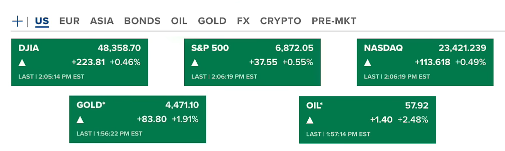 Chứng khoán Hoa Kỳ thứ hai (22/12-US) kết thúc với sự tăng trưởng ở cả ba chỉ số đều tăng trên 0.46%. Hợp đồng dầu tăng lên 57.92 USD/thùng. Vàng tăng lên mức cao mới 4471 USD/ounce.