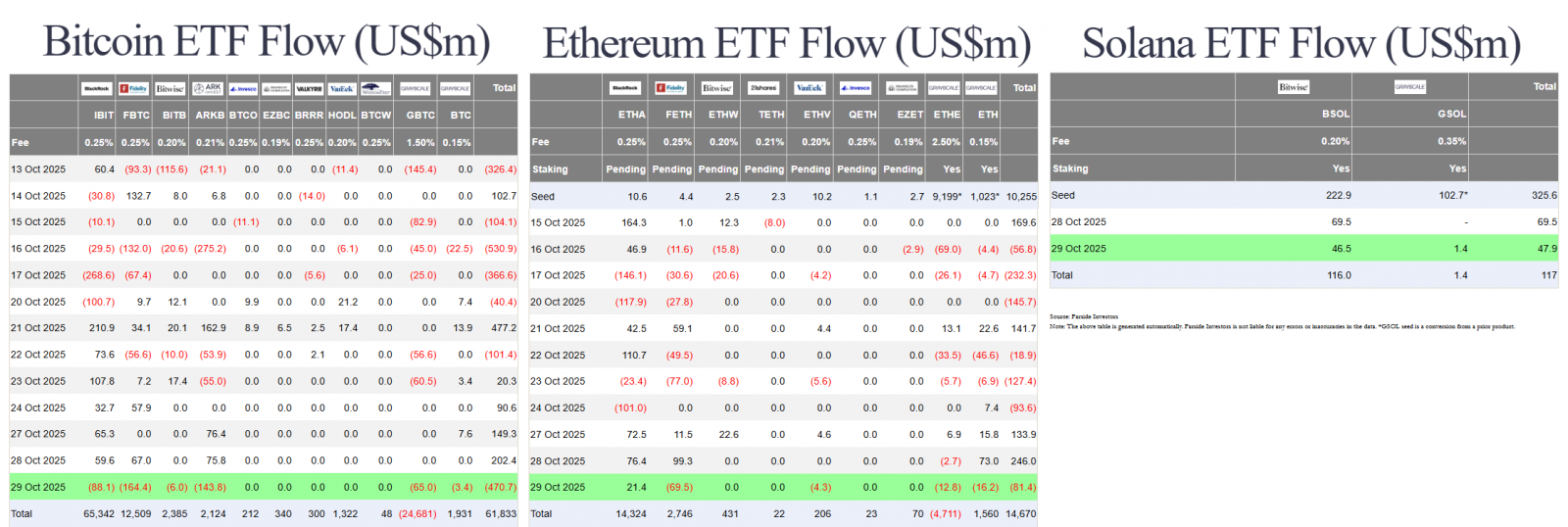 Các quỹ BTC spot ETF Hoa Kỳ trong thứ ba có dòng tiền rời khỏi đến 470.7 triệu USD khi thị trường giảm. ETH spot ETF cũng có 81.4 triệu USD tiền ra khỏi các quỹ. Còn SOL ETF vẫn có 47.9 triệu USD tiền vào.