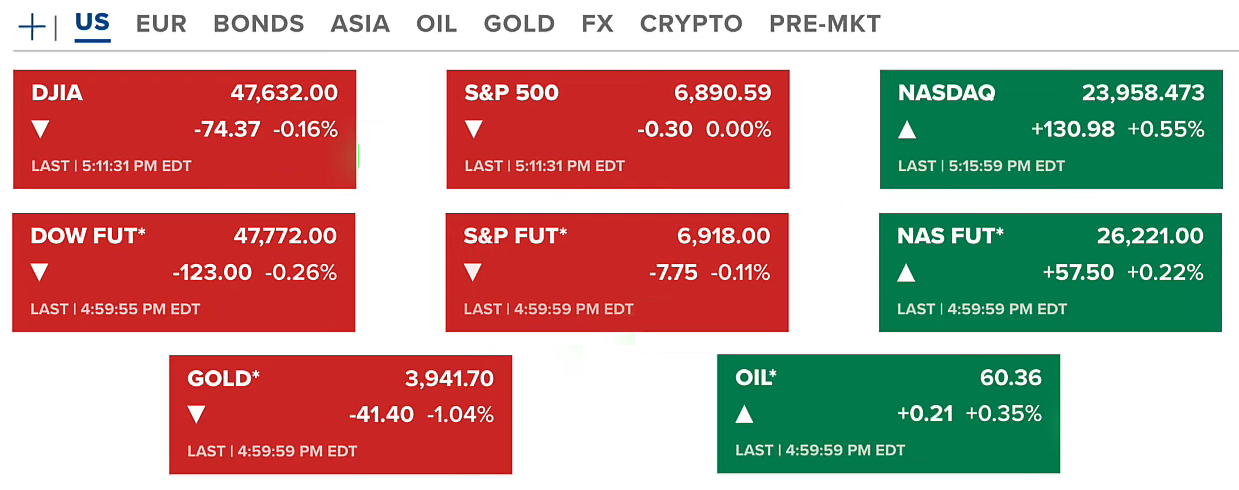 Chứng khoán Hoa Kỳ thứ tư (29/10-US) đã có sự phân hóa sau tin của Fed. Trong đó, Dow Jones và S&P 500 đều giảm, còn Nasdaq tăng nhẹ 0.55%. Hợp đồng tương lai của chứng khoán cho thấy giá sẽ tiếp tục giảm với xu hướng tương tự. Vàng giảm về 3941 USD/ounce. Dầu tăng nhẹ lên 60.36 USD/thùng.