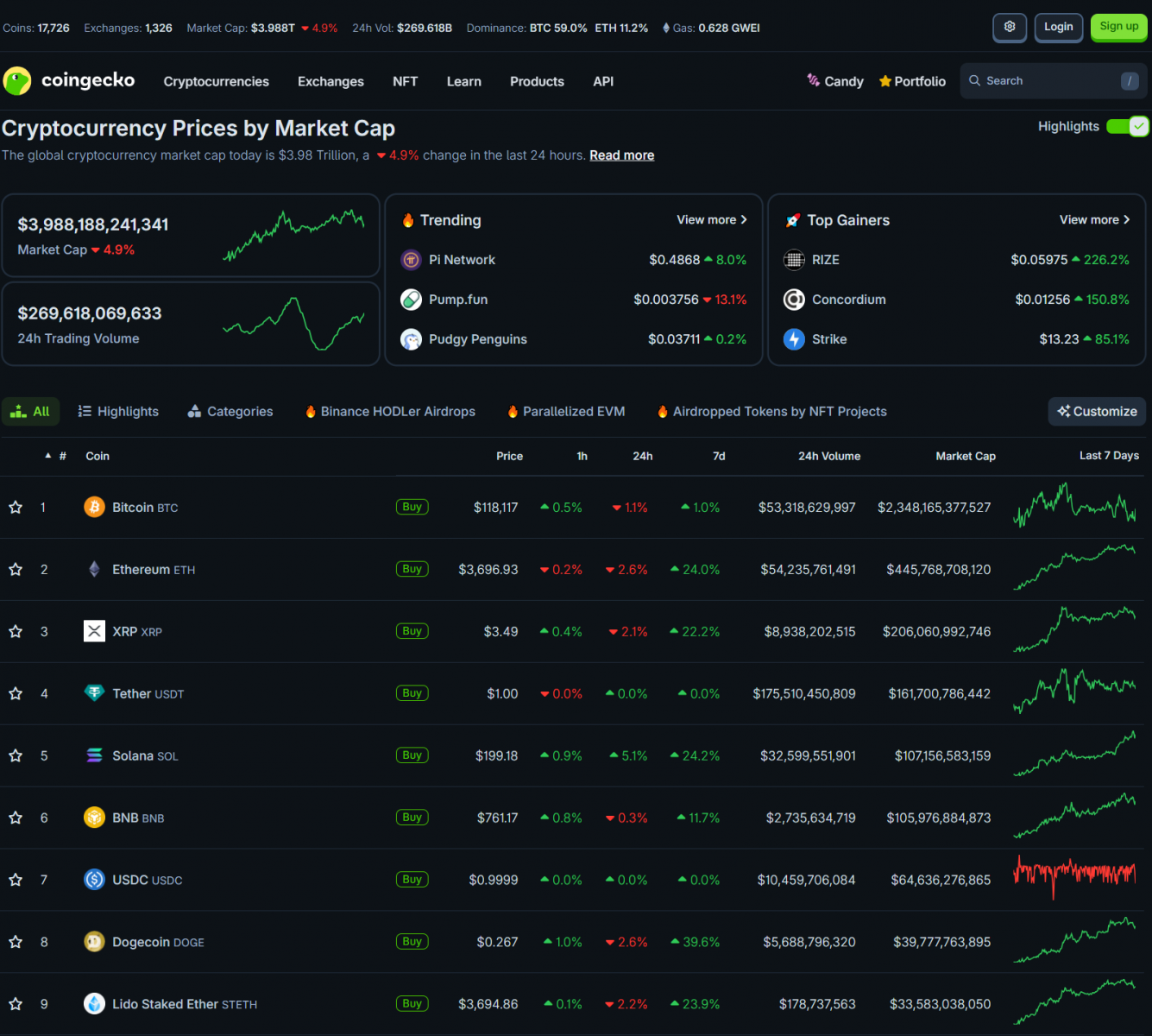 Bitcoin có thời điểm tăng lên 119,000 USD, rồi điều chỉnh về 116,000 USD và hồi về quanh 118,000 USD. Các altcoin có một số đồng tăng, một số khác lại giảm. Vốn hóa thị trường crypto giảm nhẹ còn 3.98 nghìn tỷ USD.