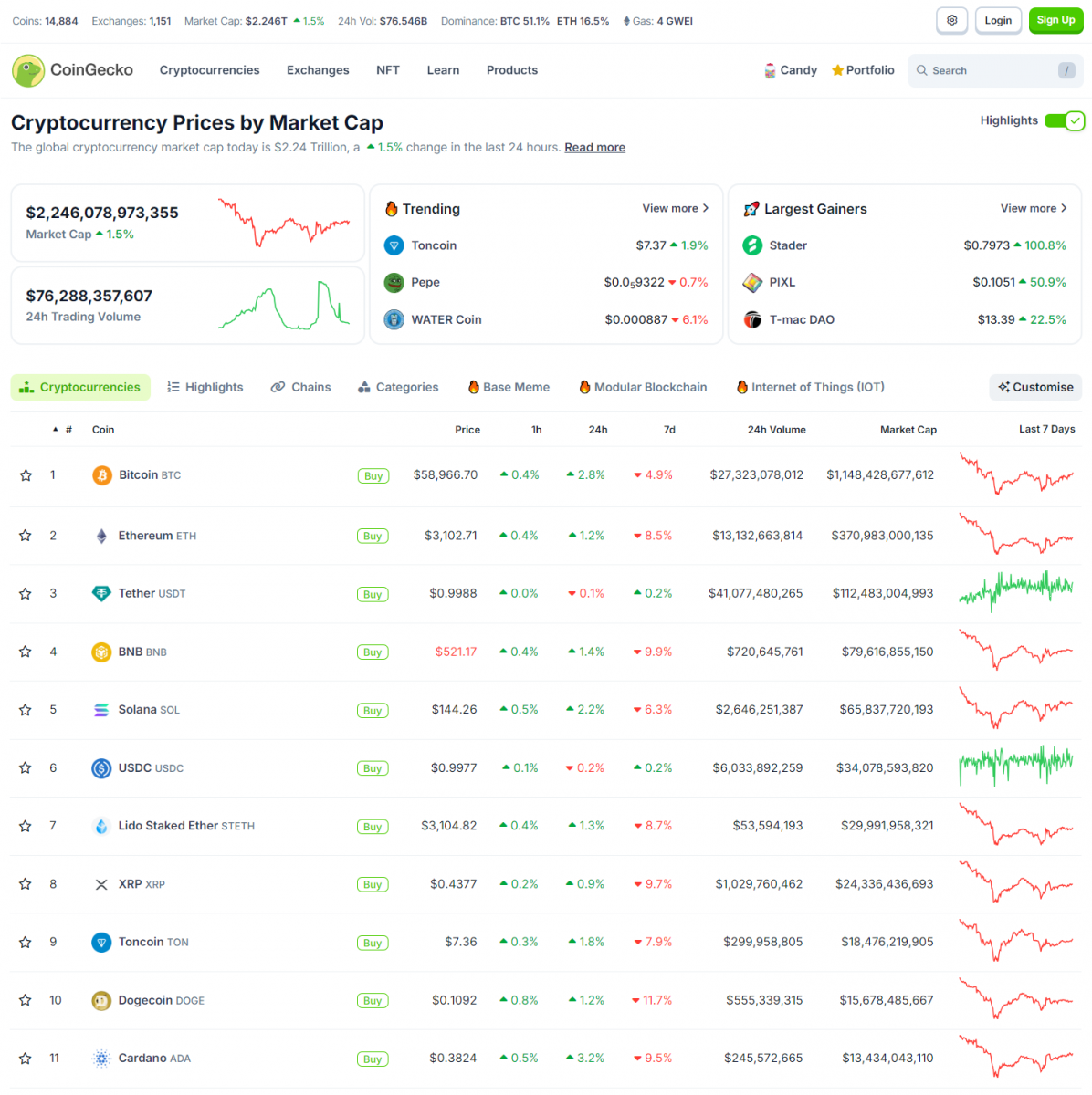 Giá Bitcoin đã tiếp tục hồi phục về 58,000 USD. Altcoin cũng tăng nhẹ. Vốn hóa thị trường crypto ở mức 2.246 nghìn tỷ USD.