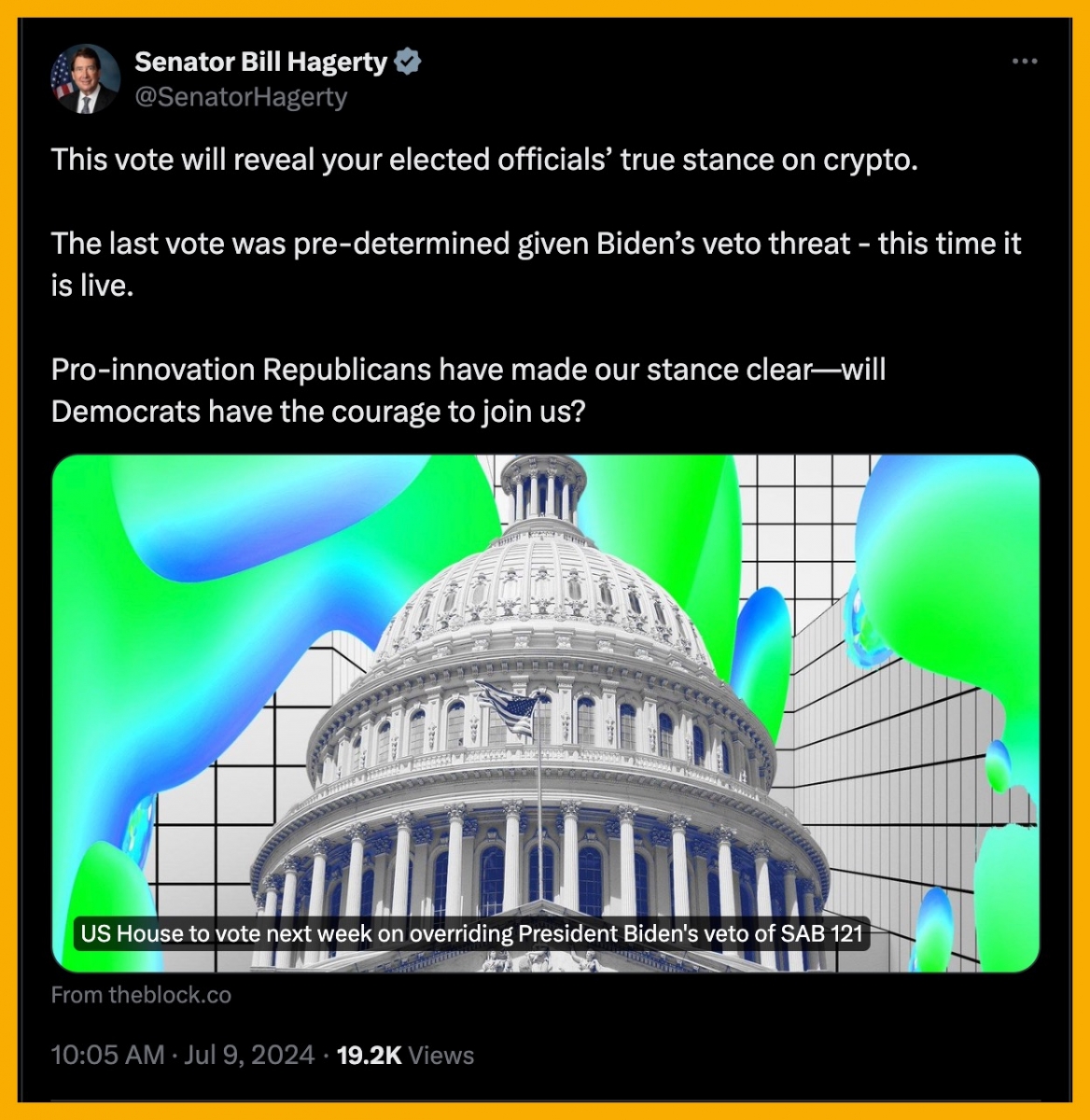 Thượng nghị sĩ Hoa Kỳ Bill Hagerty phát biểu rằng cuộc bỏ phiếu để lật ngược quyền phủ quyết của Tổng thống Biden về việc loại bỏ quy tắc SEC SAB121 sẽ tiết lộ rõ ràng lập trường thực sự của các quan chức được bầu về vấn đề crypto. Đây là cơ hội để họ cập nhật và thể hiện quan điểm của mình. Hiện tại, đảng Cộng hòa đã rõ ràng lập trường ủng hộ crypto, liệu đảng Dân chủ có sẵn sàng tham gia và ủng hộ sự đổi mới này hay không?