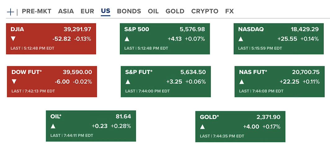 Chứng khoán Hoa Kỳ thứ ba (09/07), chỉ số Dow Jones giảm nhẹ, còn S&P 500 và Nasdaq tăng. Hợp đồng tương lai của chứng khoán nghiêng về xu hướng tăng. Giá dầu điều chỉnh nhẹ về 81.6 USD/thùng. Vàng tăng lên 2371 USD/ounce.