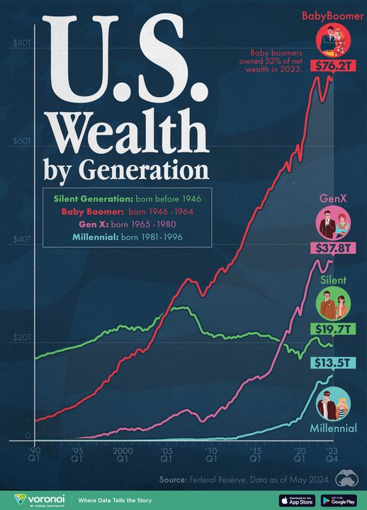 Dưới đây là thống kê tài sản (tính theo nghìn tỷ) được sở hữu bởi các thế hệ ở Hoa Kỳ. Thống kê này bao gồm: