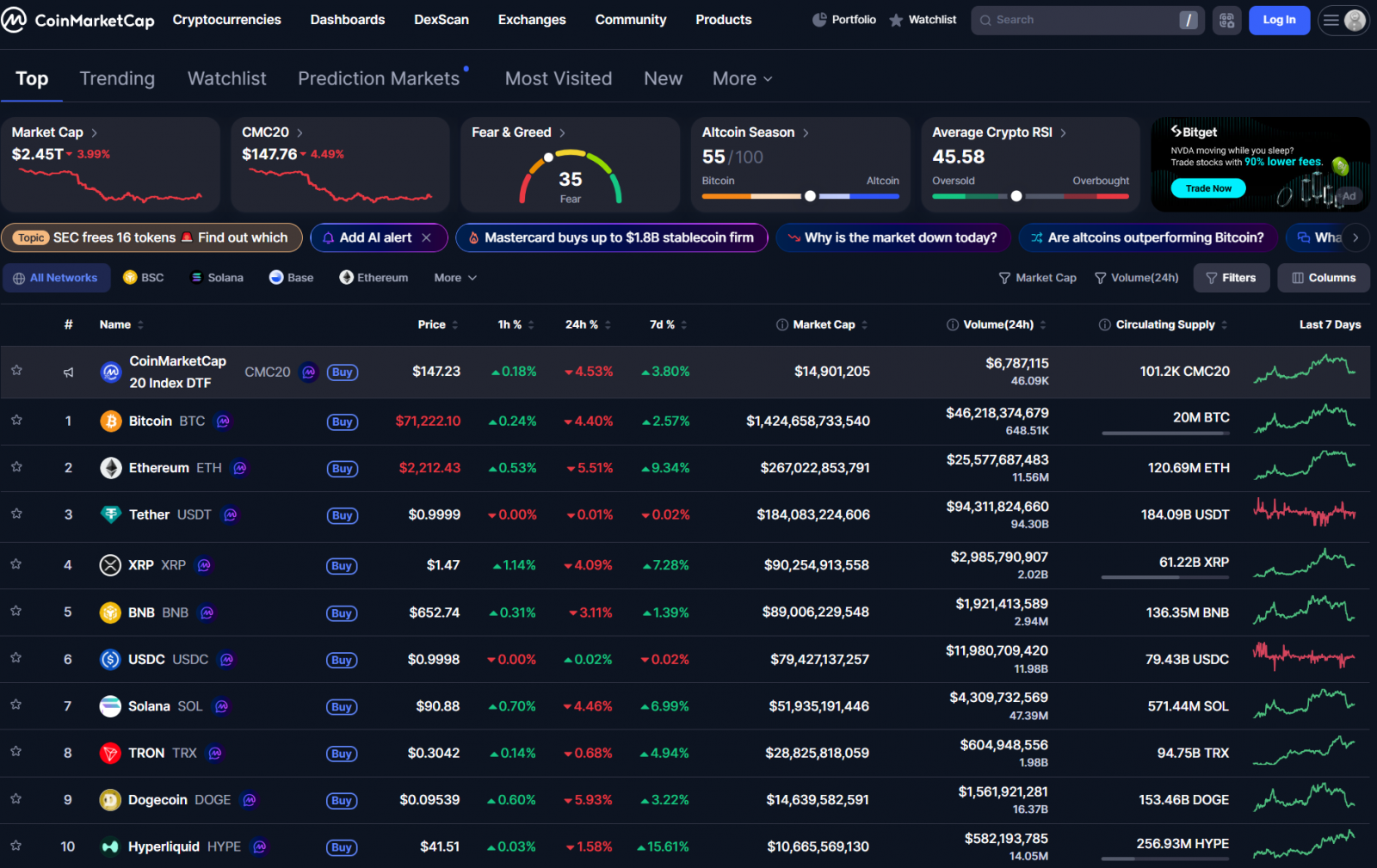 Bitcoin cũng giảm giảm từ quanh 74,000 USD xuống 71,000 USD. CÁc altcoin lớn đều giảm đáng kể. Vốn hóa thị trường crypto cũng giảm còn 2.45 nghìn tỷ USD.