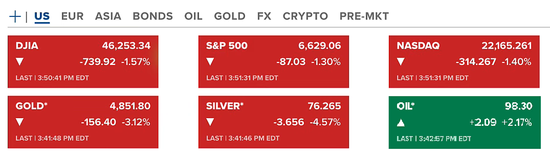 Sau khi nhận tin về Iran cũng như phát biểu của chủ tịch Fed, thị trường chứng khoán Hoa Kỳ kết thúc phiên thứ tư (18/03-US) giảm đáng kể ở cả ba chỉ số, với S&P 500 giảm ít nhất 1.3% và giảm nhiều nhất là 1.57% ở chỉ số Dow Jones. Hợp đồng vàng và bạc cũng giảm về quanh 4851 USD/ounce và 76.26 USD/ounce. Dầu vẫn giữ ở mức 98.3 USD/ounce.