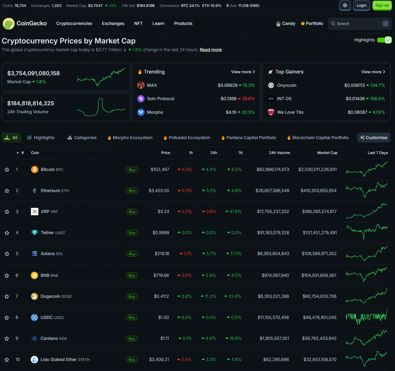 Bitcoin cũng đã tăng lên 102,000 USD trong ngày qua. Hầu hết các altcoin tăng trưởng, trong đó XRP đã tăng vượt 3 USD, ETH yếu hơn và không có sự thay đổi nhiều về giá so với BTC. Vốn hóa thị trường crypto tăng lên 3.75 nghìn tỷ USD.