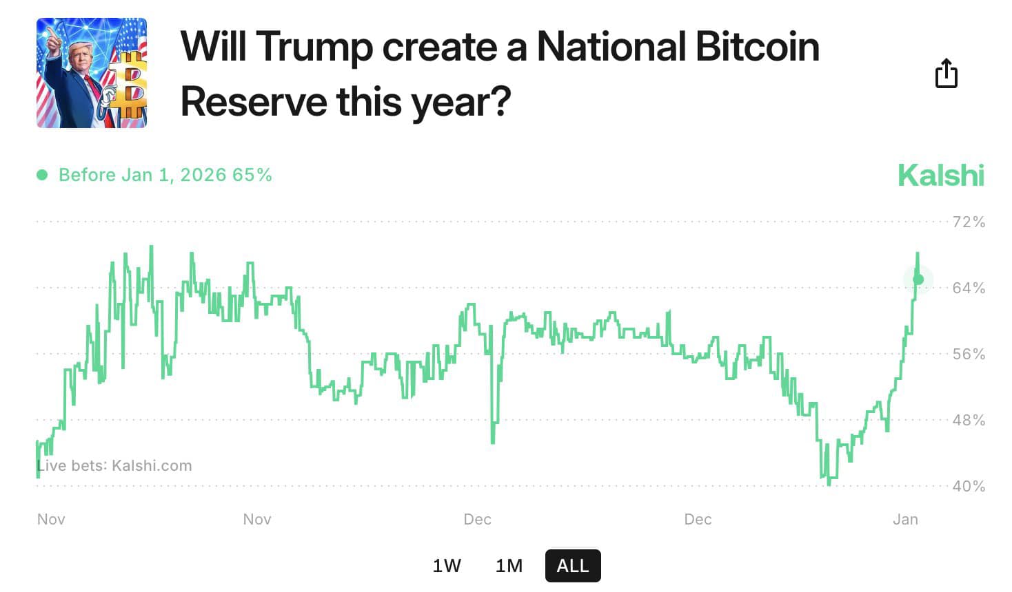 Khả năng Hoa Kỳ thành lập một kho dự trữ Bitcoin trong năm nay đã tăng lên 65% trên nền tảng cá cược Kalshi. Đây là mức tăng 50% về xác suất so với vài tuần trước.