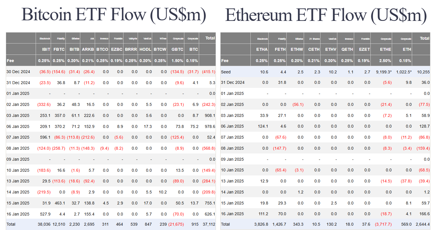 Các quỹ BTC spot ETF Hoa Kỳ kết thúc thứ năm (16/01) với dòng tiền vào dương trở lại. Tổng dòng tiền vào các quỹ này là 626 triệu USD, trong đó phần lớn dòng tiền đến từ IBIT và ARKB. Còn ETH spot ETF cũng có dòng tiền vào lên đến 166 triệu USD.