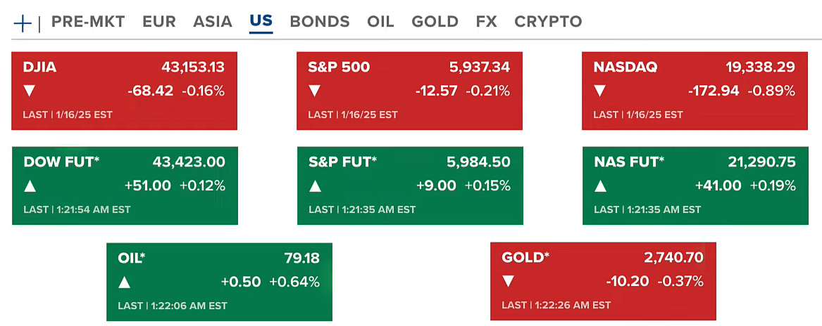 Chứng khoán Hoa Kỳ thứ năm (16/01-US) kết thúc với sự điều chỉnh ở cả ba chỉ số. Tuy nhiên, hợp đồng tương lai của chứng khoán đã hồi phục và tăng nhẹ. Hợp đồng vàng và dầu ở quanh mức 2740 USD/ounce và 79 USD/thùng.