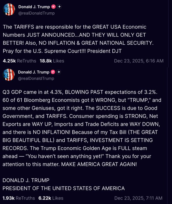 Sau đó, tổng thống Trump đã đăng bài và cho rằng các số liệu kinh tế Mỹ rất mạnh, bao gồm tăng trưởng GDP quý 3 đạt 4.3% so với mức dự báo 3.2% là nhờ thuế quan và chính sách điều hành tốt của chính phủ. Ông cũng khẳng định phần lớn các nhà kinh tế đã dự báo sai trong khi các biện pháp thuế và luật thuế của ông đã thúc đẩy đầu tư, giữ chi tiêu tiêu dùng ở mức cao, cải thiện xuất khẩu, giảm nhập khẩu và thâm hụt thương mại, không gây lạm phát, tăng cường an ninh quốc gia và mở ra một giai đoạn hoàng kim mới của kinh tế Mỹ với đà tăng trưởng còn mạnh hơn nữa trong thời gian tới.