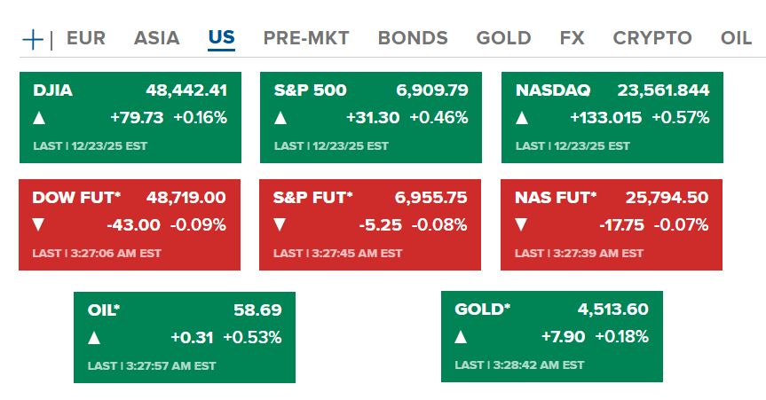 Chứng khoán Hoa Kỳ trong phiên thứ ba (23/12-US) tiếp tục là một phiên tăng trưởng ở cả ba chỉ số với Nasdaq tăng nhiều nhất 0.57%. Hợp đồng tương lai của chứng khoán gần như đi ngang nhưng nghiêng về xu hướng giảm hơn. Hợp đồng dầu quanh 58.69 USD/thùng. Vàng tăng lên mức cao mới 4513 USD/ounce.