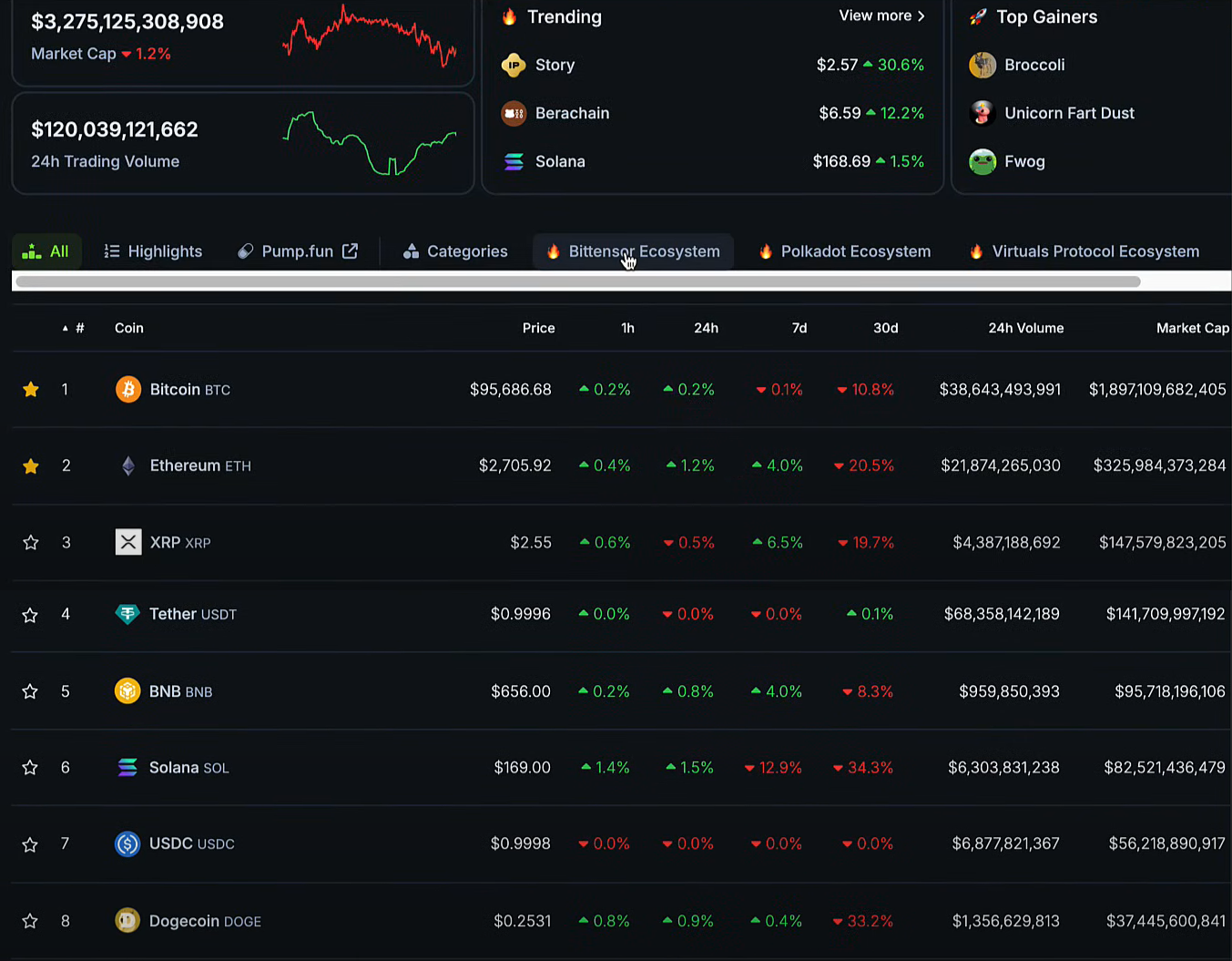 Bitcoin giữ quanh mức 95,000 USD đến 96,000 USD. Một số altcoin lớn tăng, một số điều chỉnh nhẹ. Vốn hóa thị trường crypto là 3.27 nghìn tỷ USD.