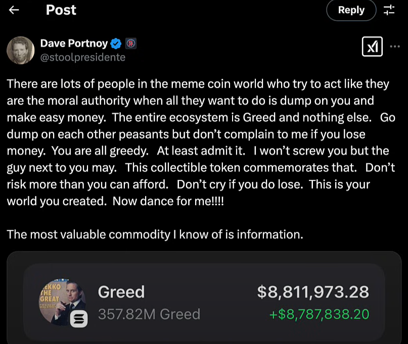 Sáng thứ ba (US), cộng đồng crypto lại chấn động khi Dave Portnoy, người sáng lập Barstool Sports, tiếp tục gây tranh cãi với việc ra mắt một memecoin mới mang tên GREED, ngay sau vụ bê bối liên quan đến đồng LIBRA. Theo lời của Dave, GREED đại diện cho lòng tham tột độ của thị trường memecoin.