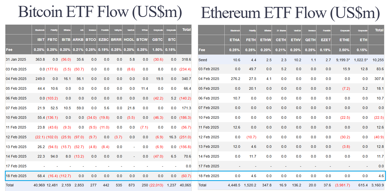 Các quỹ BTC spot ETF Hoa Kỳ thứ ba (18/02-US) là một phiên có dòng tiền rời khỏi tổng 60.7 triệu USD. Trong đó, riêng IBIT của BlackRock vẫn có dòng tiền vào 68.4 triệu USD, dòng tiền rời khỏi bởi hai quỹ FBTC và BITB. Còn ETH spot ETF vẫn có dòng tiền vào 4.6 triệu USD đến từ quỹ FETH.