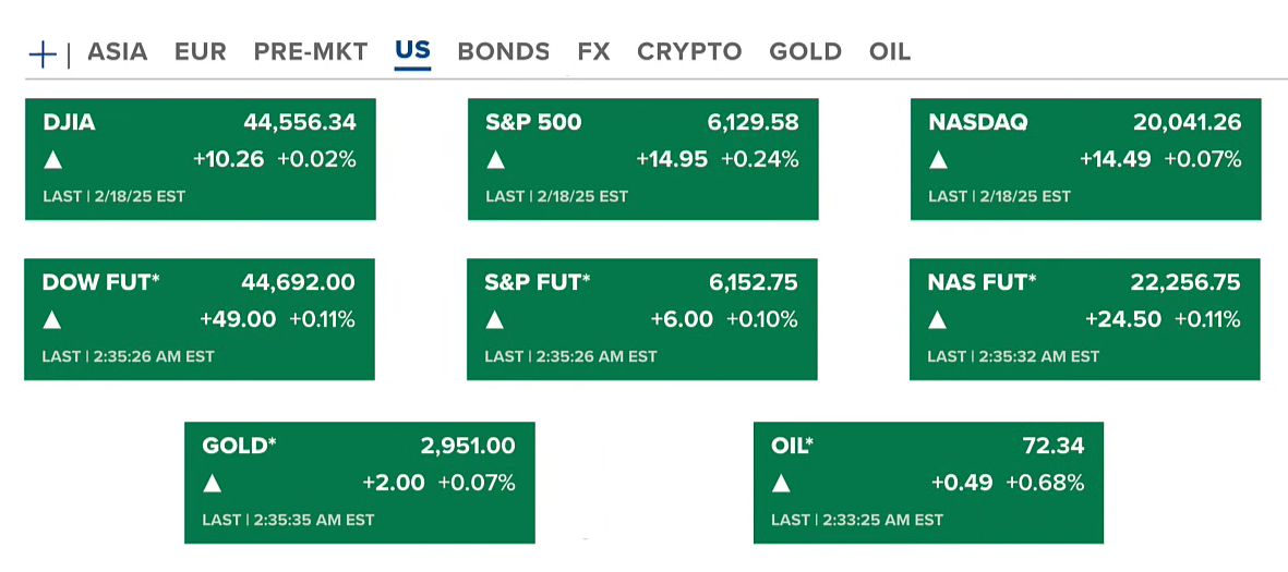 Chứng khoán Hoa Kỳ thứ ba (18/02-US) kết thúc phiên cả ba chỉ số đều tăng nhẹ. Hợp đồng tương lai của chứng khoán cùng xu hướng tăng. Vàng và dầu cũng tăng lên lần lượt 2951 USD/ounce và 72 USD/thùng.