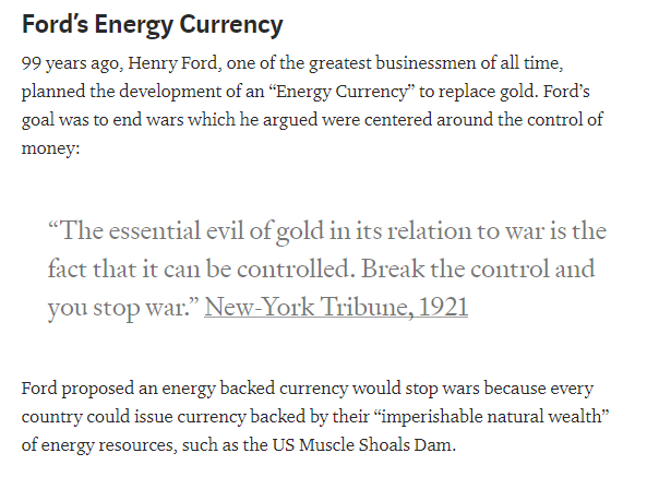 Thời điểm Henry Ford có mong muốn tìm ra một loại tiền tệ được định giá theo năng lượng nhưng ông đã không thành công ở thời điểm đó. Lý do ông đưa ra là lúc đó chưa có tài sản nào không thuộc quản lý của chính phủ để thử nghiệm mô hình của ông. Lý do thứ hai là thế giới có tiền và quyền lực không quan tâm đến thử nghiệm tiền tệ theo năng lượng. Hiện tại nhiều người cũng đặt ra câu hỏi liệu bitcoin có phải là tài sản sẽ theo mô hình của Henry Ford hay không?