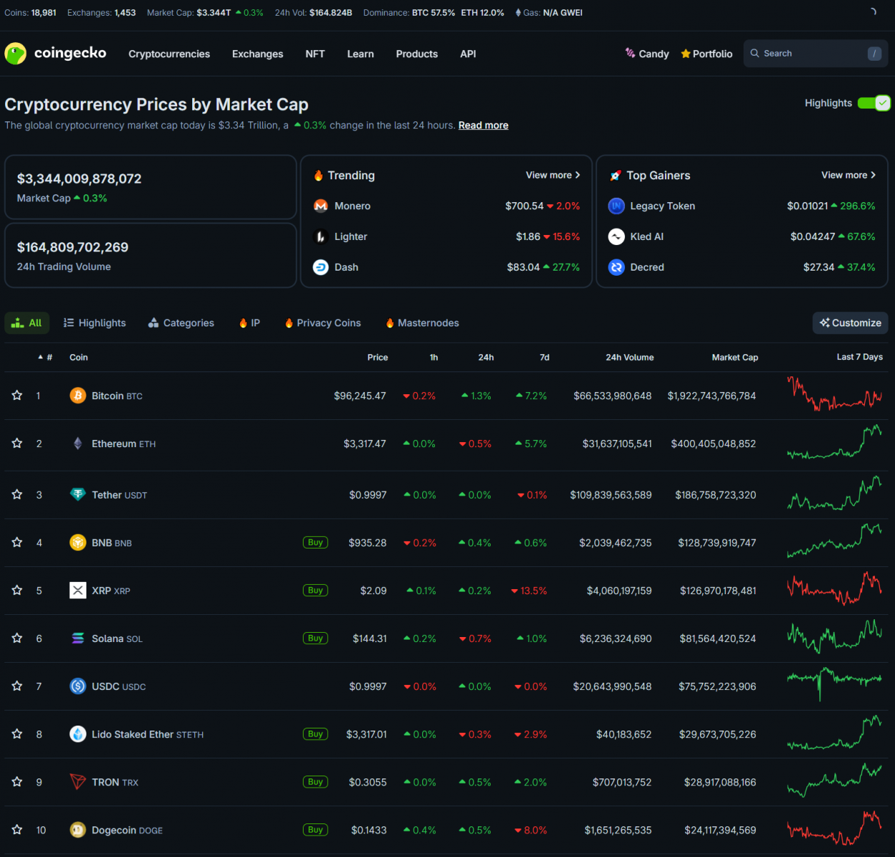 Bitcoin tăng lên gần 98,000 USD sau đó điều chỉnh về quanh 96,000 USD. Các altcoin lớn tăng nhẹ hoặc đi ngang. Vốn hóa thị trường crypto tăng lên 3.34 nghìn tỷ USD.