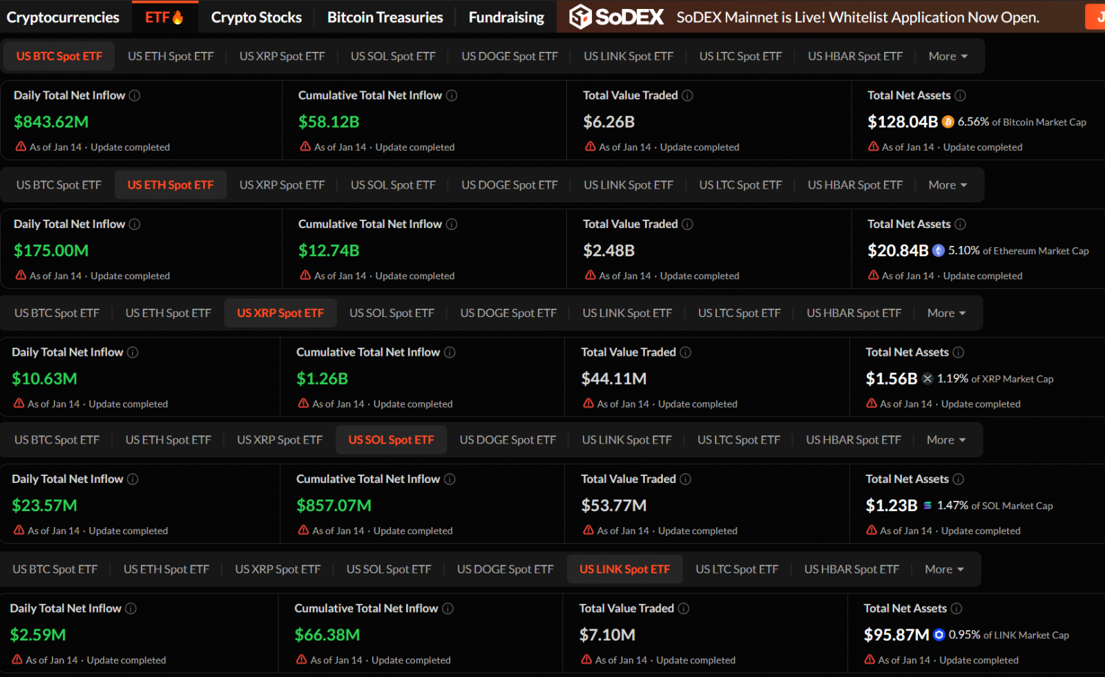 Dòng tiền ETF crypto tại Mỹ trong ngày 14/01 ghi nhận trạng thái tích cực với lực mua tập trung chủ yếu vào Bitcoin và Ethereum. Cụ thể, các quỹ ETF Bitcoin thu hút thêm 843.62 triệu USD, trong khi ETF Ethereum ghi nhận dòng vốn vào đạt 175 triệu USD.