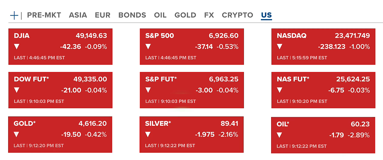 Chứng khoán Hoa Kỳ trong thứ tư (14/01-US) là một phiên giảm điểm với Nasdaq giảm nhiều nhất 1%. Hợp đồng tương lai của chứng khoán nghiêng về xu hướng giảm. Vàng và bạc điều chỉnh nhẹ nhưng sau khi bạc đã đạt đỉnh mới, giá quanh 4616 USD/ounce và 89 USD/ounce. Dầu giảm nhẹ quanh 60.23 USD/thùng.