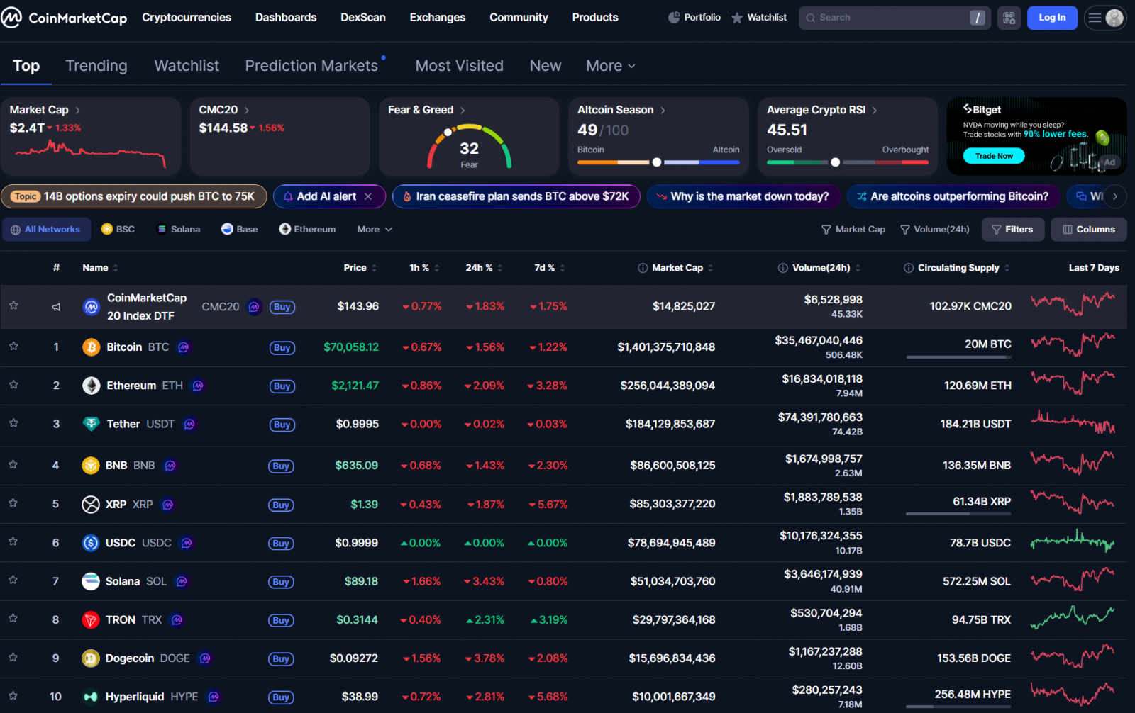 Bitcoin vẫn quanh 70,000 USD. Các altcoin lớn hầu hết đều giảm. Vốn hóa thị trường cryoto cũng giảm còn 2.4 nghìn tỷ USD.