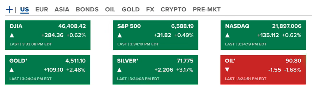 Chứng khoán Hoa Kỳ thứ tư (25/03-US) cuối phiên cả ba chỉ số đều tăng với mức tăng cao nhất 0.62% của Dow Jones và Nasdaq. Hợp đồng và bạc cũng tăng nhẹ lên 4511 USD/ounce và 71.77 USD/ounce. Dầu giảm nhẹ nhưng vẫn ở mức cao 90.8 USD/thùng.