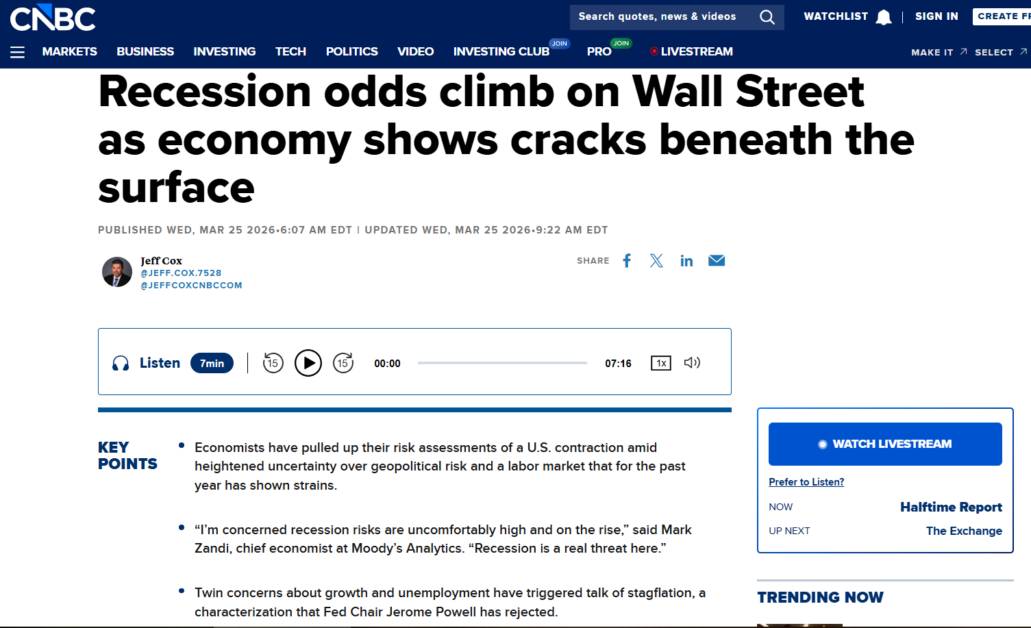 Bên cạnh đó, các dấu hiệu gia tăng rủi ro suy thoái của nền kinh tế Mỹ đang xuất hiện trên nhiều mặt như thị trường lao động, tăng trưởng GDP và lĩnh vực cho vay ngoài ngân hàng. Các tổ chức tài chính lớn đã đồng loạt nâng dự báo xác suất suy thoái trong 12 tháng tới lên mức cao hơn đáng kể so với trước, từ khoảng 20% lên vùng 30–48.6%. Dù vẫn dưới 50%, xu hướng tăng cho thấy rủi ro đang gia tăng, đặc biệt nếu giá dầu và gián đoạn chuỗi cung ứng kéo dài. Tâm lý người dân cũng trở nên thận trọng hơn khi 65% người được khảo sát tin rằng suy thoái có thể xảy ra, điều này có thể làm giảm chi tiêu và khiến tăng trưởng chậm lại.