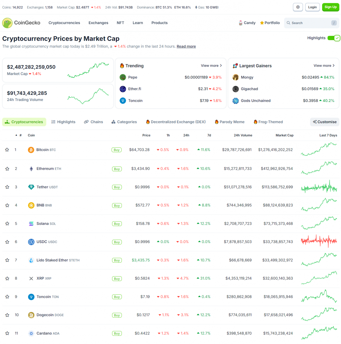 Giá Bitcoin giữ quanh 64,900 USD sau khi tăng lên 66,000 USD. Đa số altcoin giảm nhẹ. Vốn hóa thị trường crypto ở mức 2.487 nghìn tỷ USD.