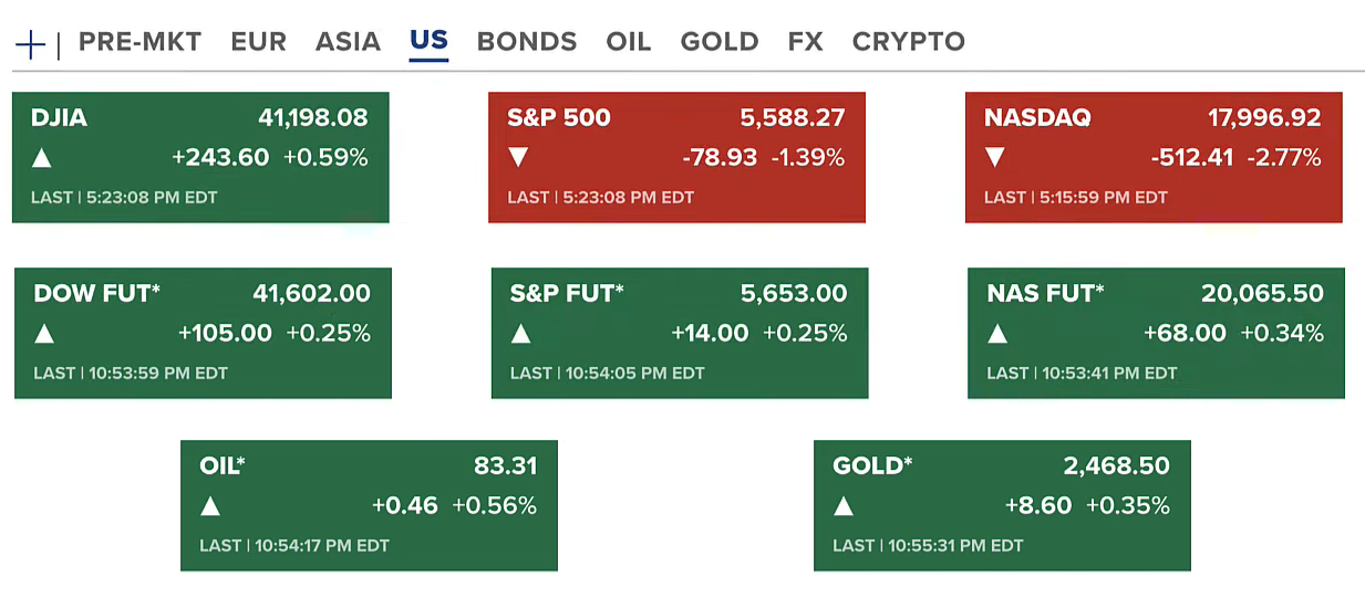 Chứng khoán Hoa Kỳ thứ tư (17/07) với Dow Jones tăng 0.59%, hai chỉ số còn lại đều giảm, Nasdaq giảm mạnh 2.77%. Hợp đồng tương lai của chứng khoán xanh nhẹ. Dầu và vàng đều tăng lên quanh 83 USD/thùng và 2468 USD/ounce.