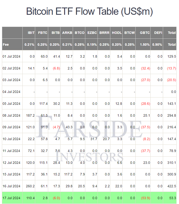 Phiên giao dịch thứ tư (17/07), các quỹ BTC spot ETF kết thúc tiếp tục có dòng tiền vào dương 53 triệu USD. Đứng đầu là IBIT của BlackRock với dòng tiền vào 110 triệu USD, còn GBTC có dòng tiền rời khỏi 53.9 triệu USD.