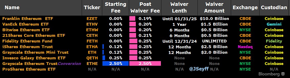 Phí quản lý của các quỹ này rất thấp, tương tự như Bitcoin ETF, và 7 trong 10 quỹ đã có chế độ giảm giá hoặc miễn phí trong thời gian từ 6-12 tháng để thu hút các nhà đầu tư. Tuy nhiên, Grayscale là một ngoại lệ với phí 2.5%, cao gấp 10 lần so với các quỹ còn lại, điều này có thể dẫn đến việc Grayscale bán ra trong khoảng 2 tháng đầu. Grayscale Ethereum Trust ETF hiện đang giữ 2.92 triệu ETH, tương đương khoảng 10 tỷ USD.