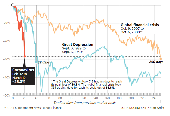 Hình trên là biểu đồ về thời gian giảm giá của chứng khoán do ảnh hưởng của coronavirus với những cuộc khủng hoảng trước đây. Như trên ta thấy được chỉ sau gần 20 ngày mà chứng khoán Mỹ đã xuống 30% tính đến ngày 12/03. Trong khi đó, đợt đại khủng hoảng năm 1987 thì giảm 30% trong khoảng 39 ngày, đợt khủng hoảng năm 2007-2008 thì sau 250 ngày thị trường mới giảm xuống 30%. Thống kê thấy rằng chứng khoán đã giảm vừa rồi là một bán tháo đã xóa sạch phần lớn lợi nhuận của Phố Wall kể từ khi Tổng thống Donald Trump nhậm chức.