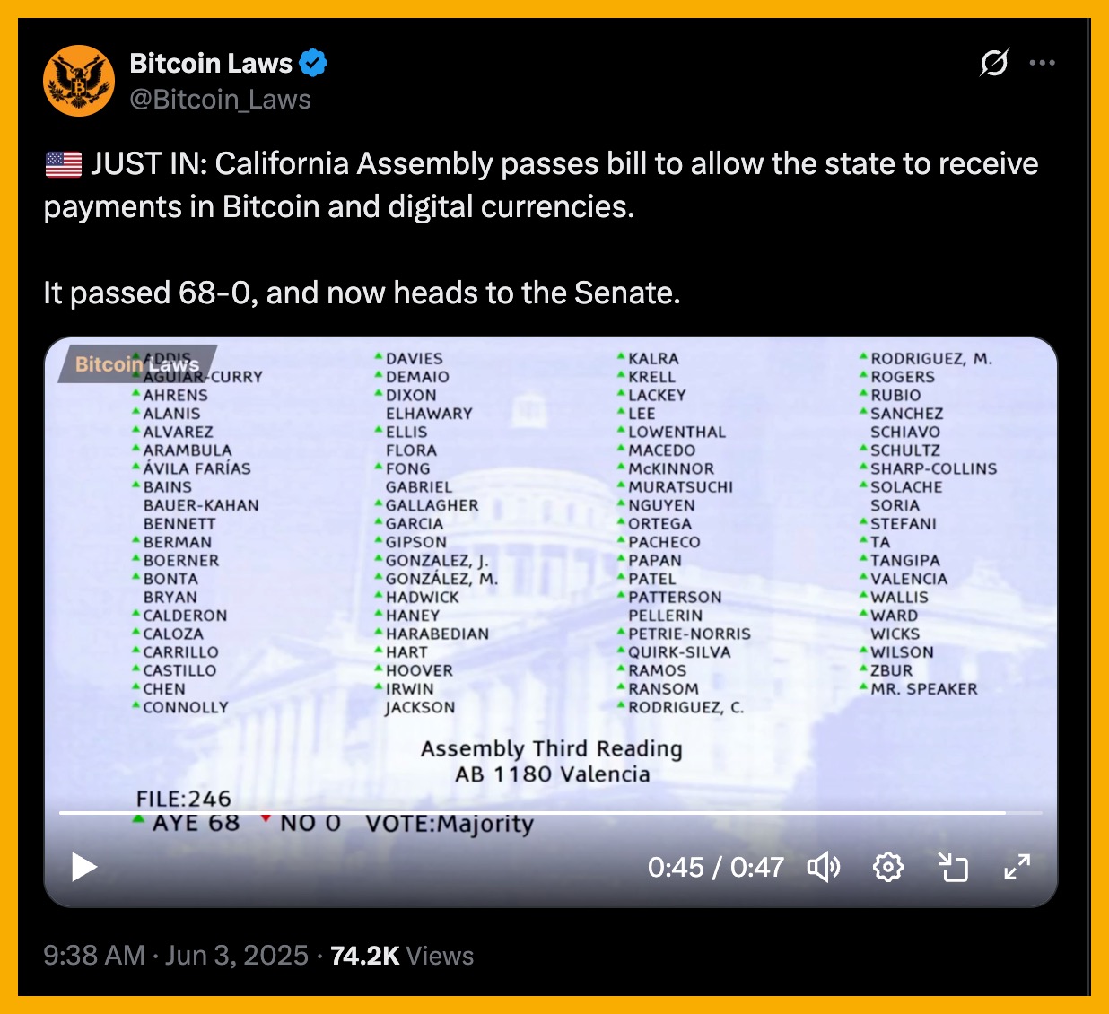Tiểu bang California vừa có bước tiến quan trọng trong việc tiếp cận công nghệ tài chính khi Dự luật AB 1180 được Hạ viện bang thông qua với số phiếu tuyệt đối 68-0. Dự luật này cho phép các cơ quan nhà nước tại California thu phí và xử lý giao dịch bằng crypto, theo quy định của Luật Tài sản Tài chính Kỹ thuật số (DFAL).