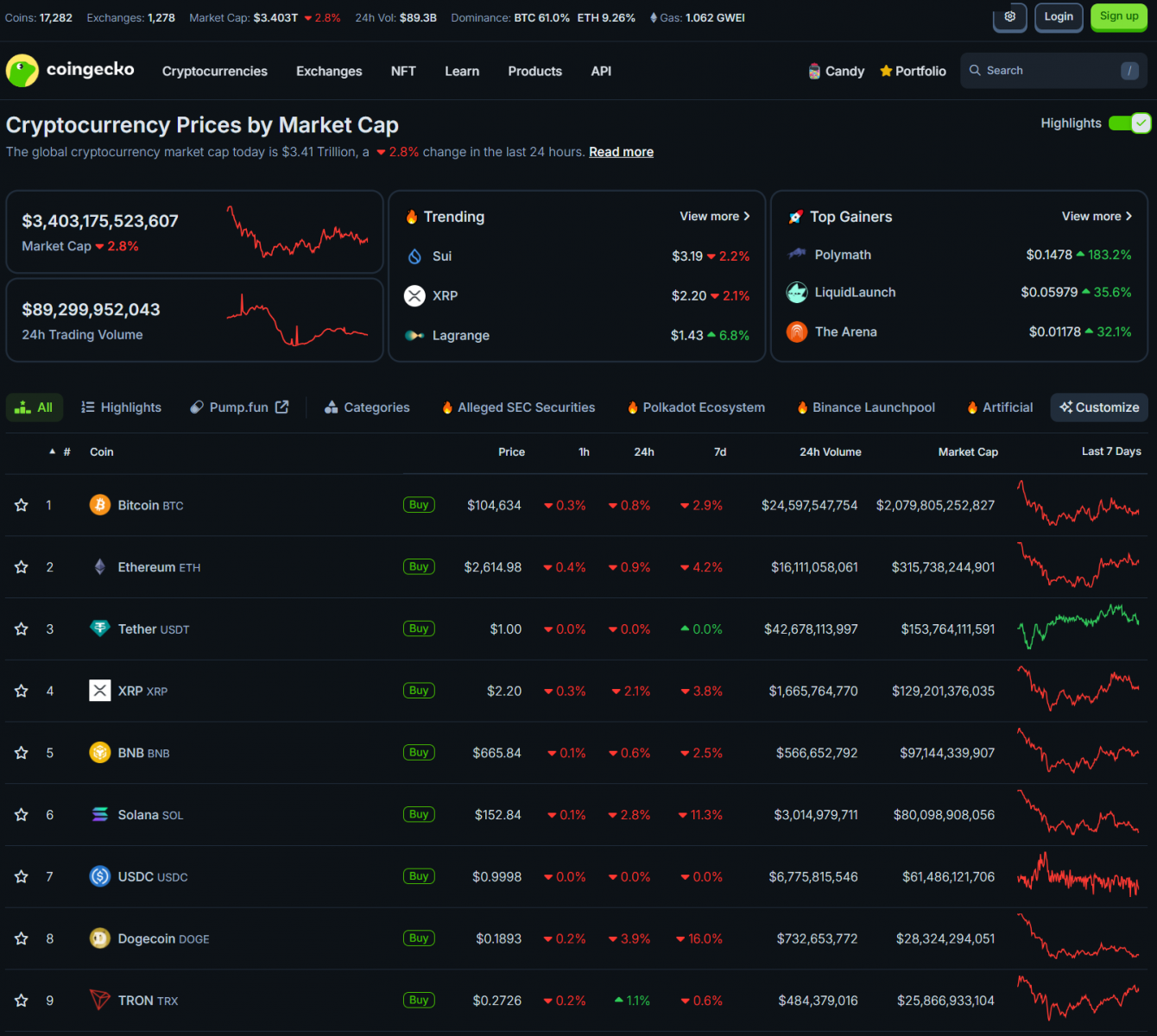 Bitcoin giảm nhẹ về quanh 104,000 USD. Hầu hết altcoin lớn đều giảm. Vốn hóa thị trường crypto giảm về 3.4 nghìn tỷ USD.