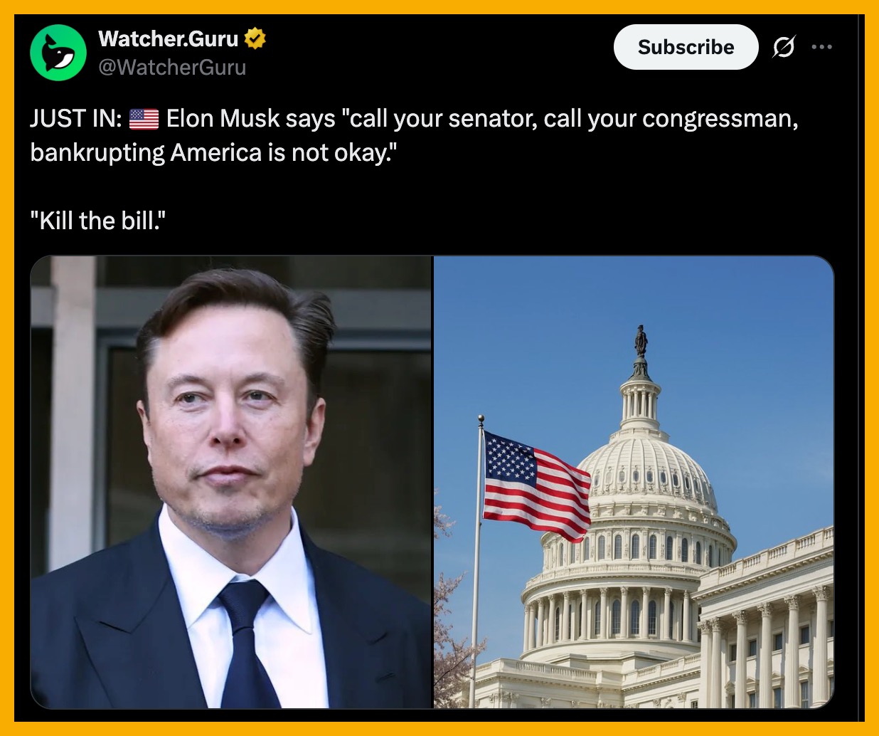 Elon Musk cảnh báo rằng lãi vay đang “ăn sạch” ngân sách Mỹ. Ông lấy dẫn chứng 25% nguồn thu ngân sách của chính phủ Mỹ đang được dùng chỉ để trả tiền lãi vay. Nếu tình trạng chi tiêu vượt kiểm soát tiếp tục, chính phủ sẽ không còn đủ ngân sách cho các lĩnh vực thiết yếu như an sinh xã hội, y tế hay quốc phòng — tất cả có thể bị cắt giảm, chỉ còn lại chi phí trả lãi.