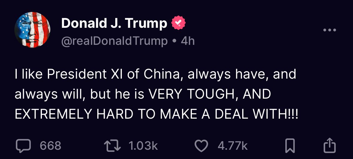Tổng thống Donald Trump: “Tôi thích Chủ tịch Tập của Trung Quốc, luôn luôn như vậy, và sẽ luôn như vậy, nhưng ông ấy RẤT CỨNG RẮN và CỰC KỲ KHÓ ĐỂ ĐẠT ĐƯỢC MỘT THỎA THUẬN!!!”